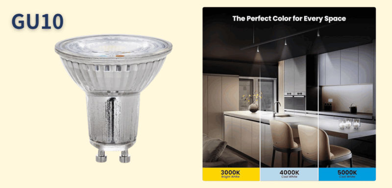 - GU10:2本の短いピンを回して固定するタイプ。スポットライト系に多い。